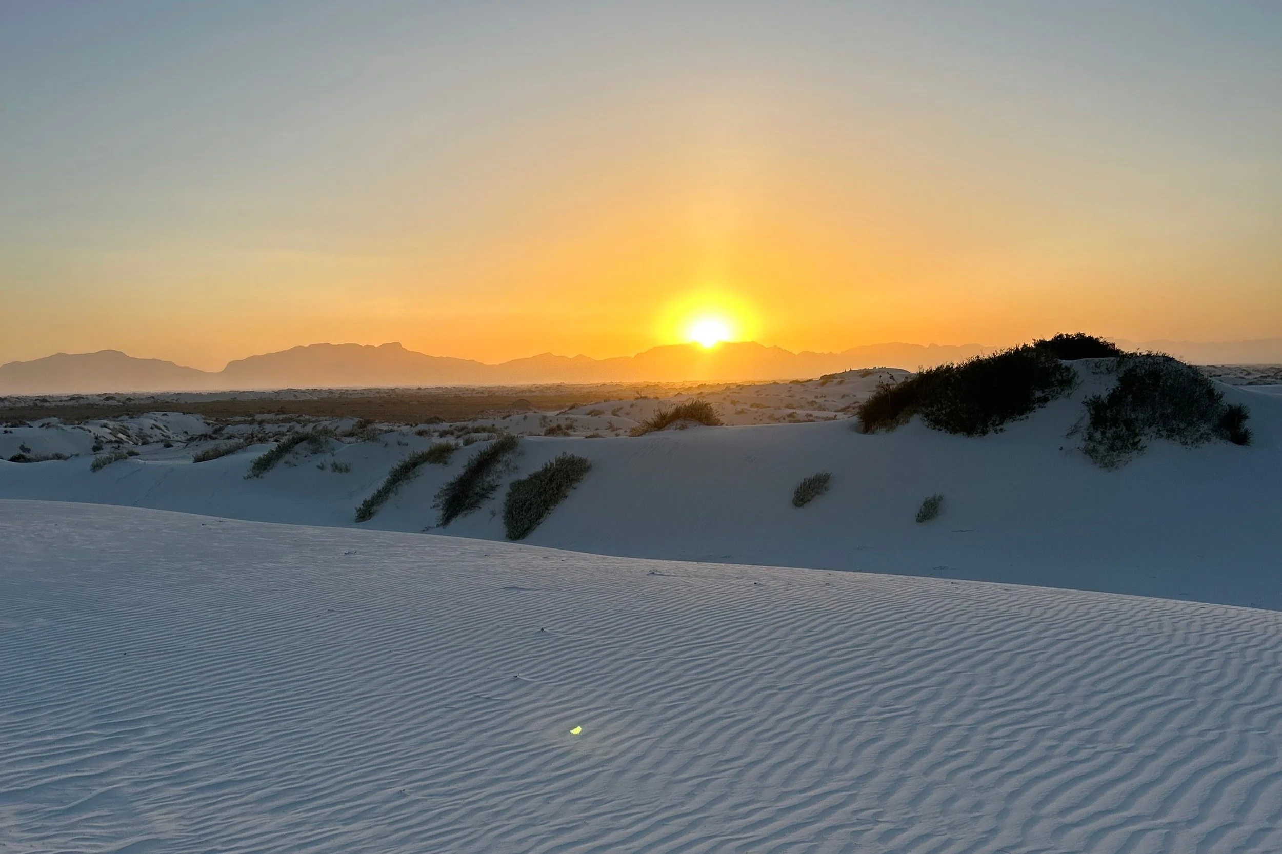 The setting sun in White Sands, New Mexico. I drew inspiration from the stillness of this place and the impact that each little footprint had on an individual’s perception of the area. There is no small disturbance when everything in sight is so uniform. I loved it here.